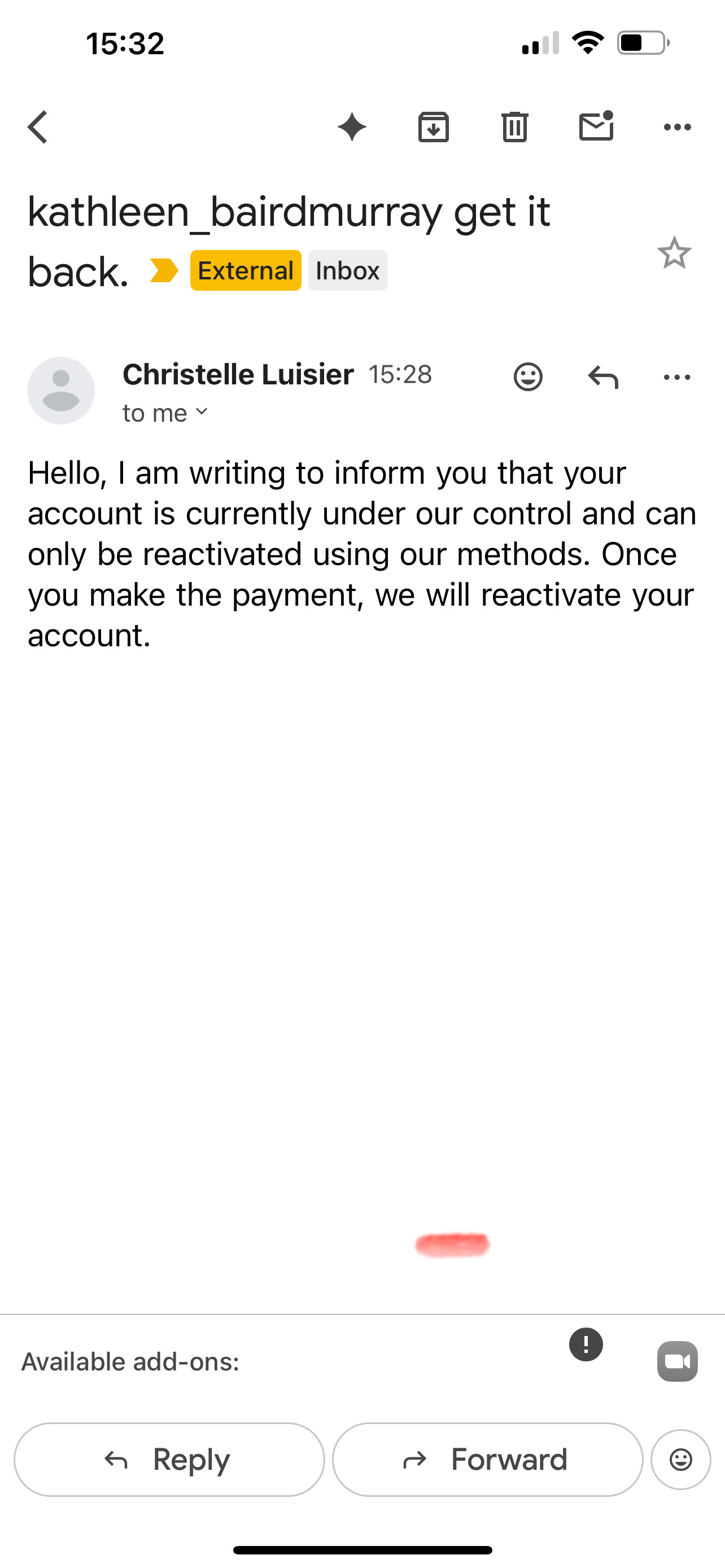 And then an email saying if I wanted my account back I needed to contact someone called Christelle Luisier (go figure) and it would cost me. I did not reply.